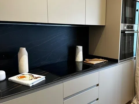 Cocina abierta de diseño, completamente equipada con electrodomésticos integrados y acabados de alta gama.
